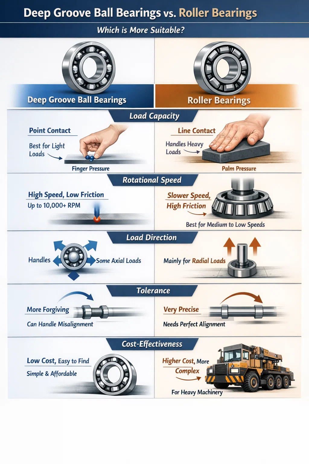 Rulllager: Rullarna inuti är cylindriska eller koniska, vilket resulterar i "linjekontakt". Det här är som att trycka på ett bord med handflatan jämfört med att trycka på det med fingret – det förra är starkare. De är mycket robusta och tål enorm vikt och stötar.